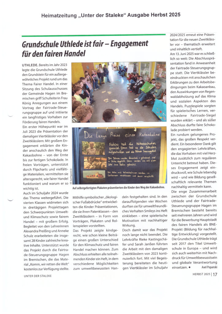 Projekt „Komm wir retten mal die Welt“ und „Fairtrade am Beispiel von Kakao“ jeweils von Viertklässlern für Zweitklässler aufbereitet mit Unterstützung der Fairtradegruppe Hagen im Bremischen.